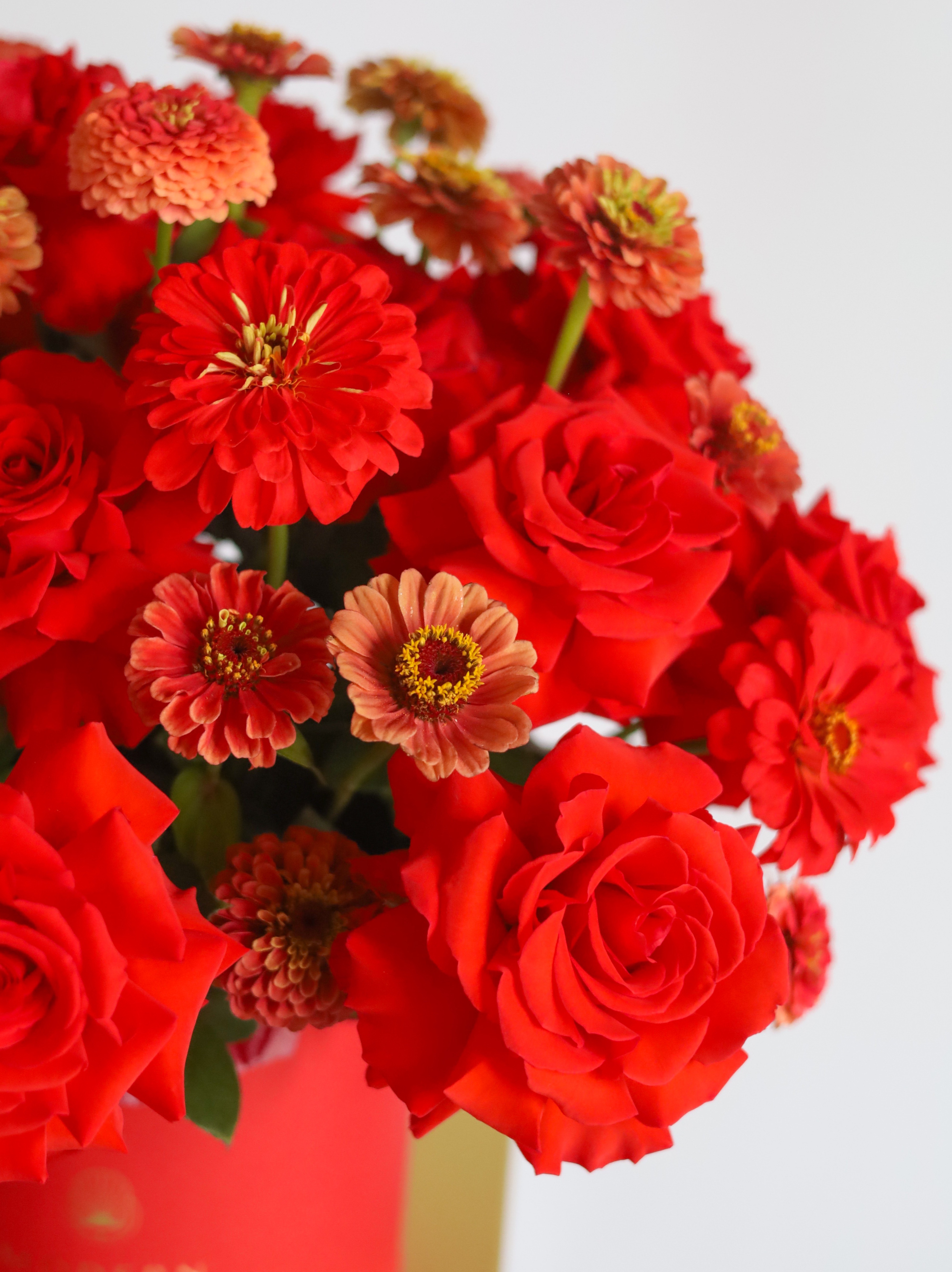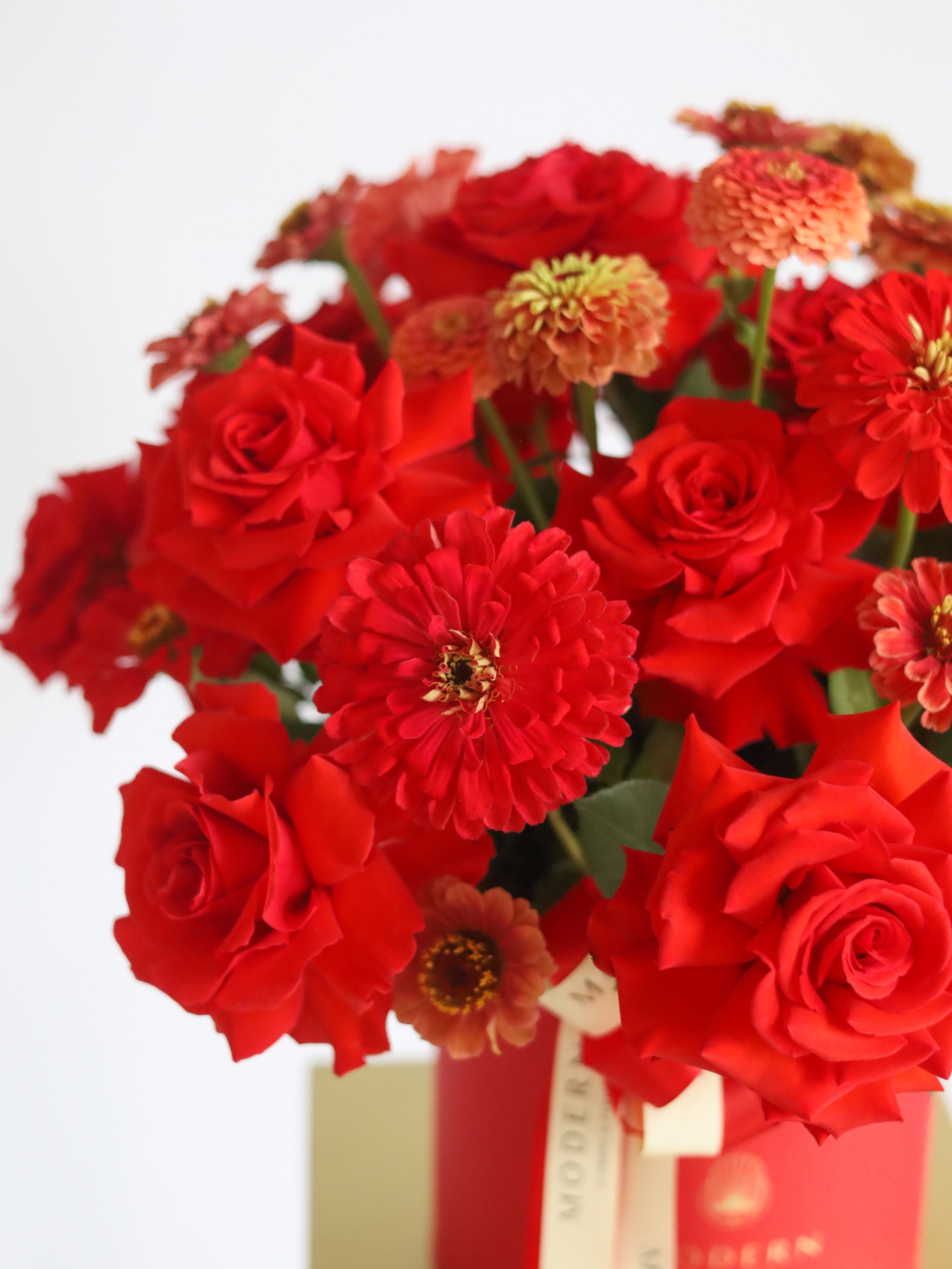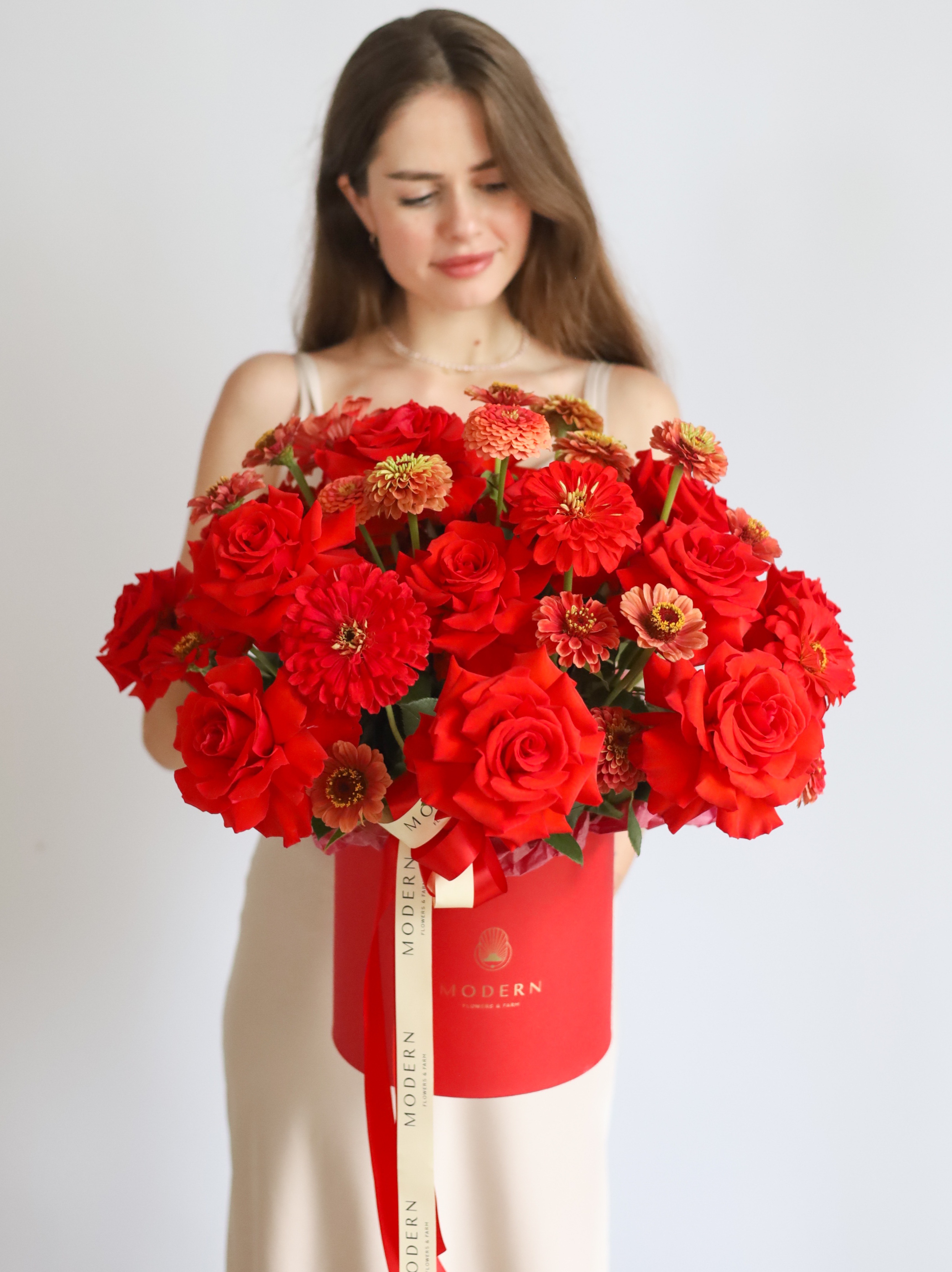 Цинния добавляет композиции яркости и объема, привнося в букет нотки природной свежести и жизнерадостности.
