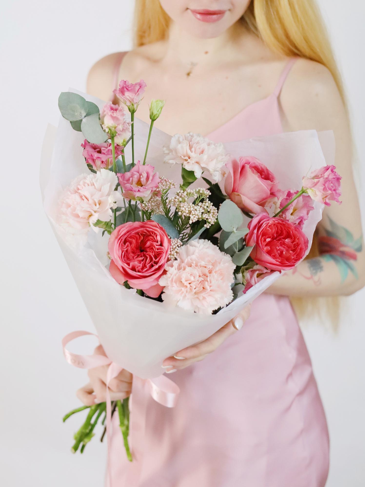 —БУКЕТ С ПИОНОВИДНОЙ РОЗОЙ, ЭУСТОМОЙ И ОЗОТАМНУСОМ