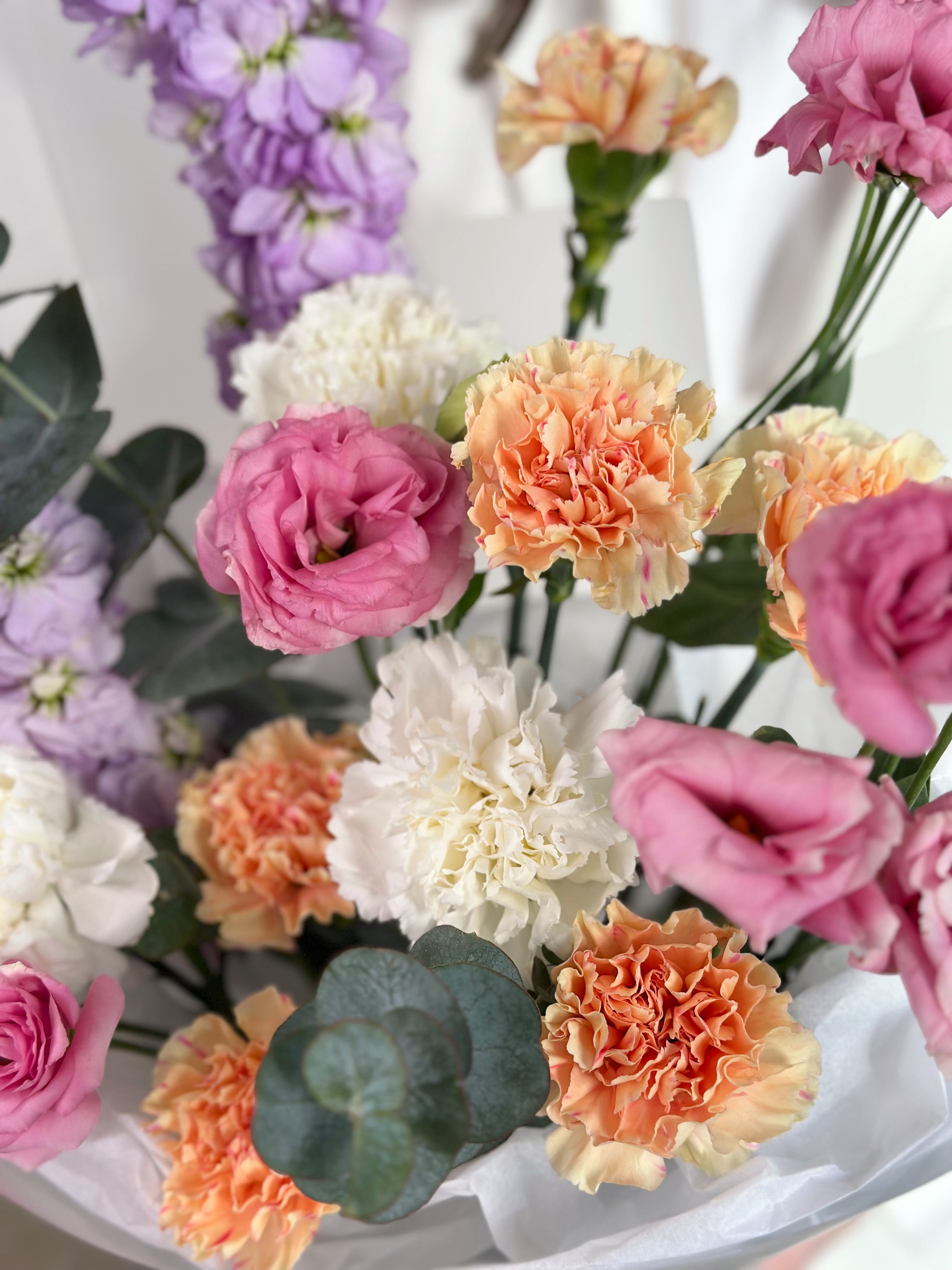 —БУКЕТ В ПАСТЕЛЬНЫХ ОТТЕНКАХ С МАТТИОЛОЙ, ЭУСТОМОЙ И ГВОЗДИКОЙ