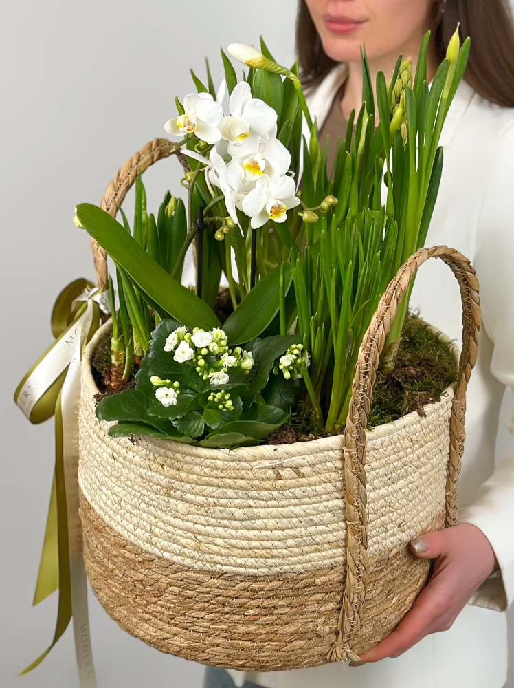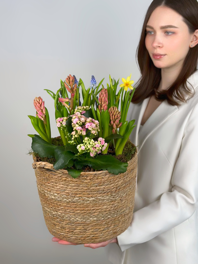 КОРЗИНА С ЛУКОВИЧНЫМИ ВЕСЕННИМИ ЦВЕТАМИ №4