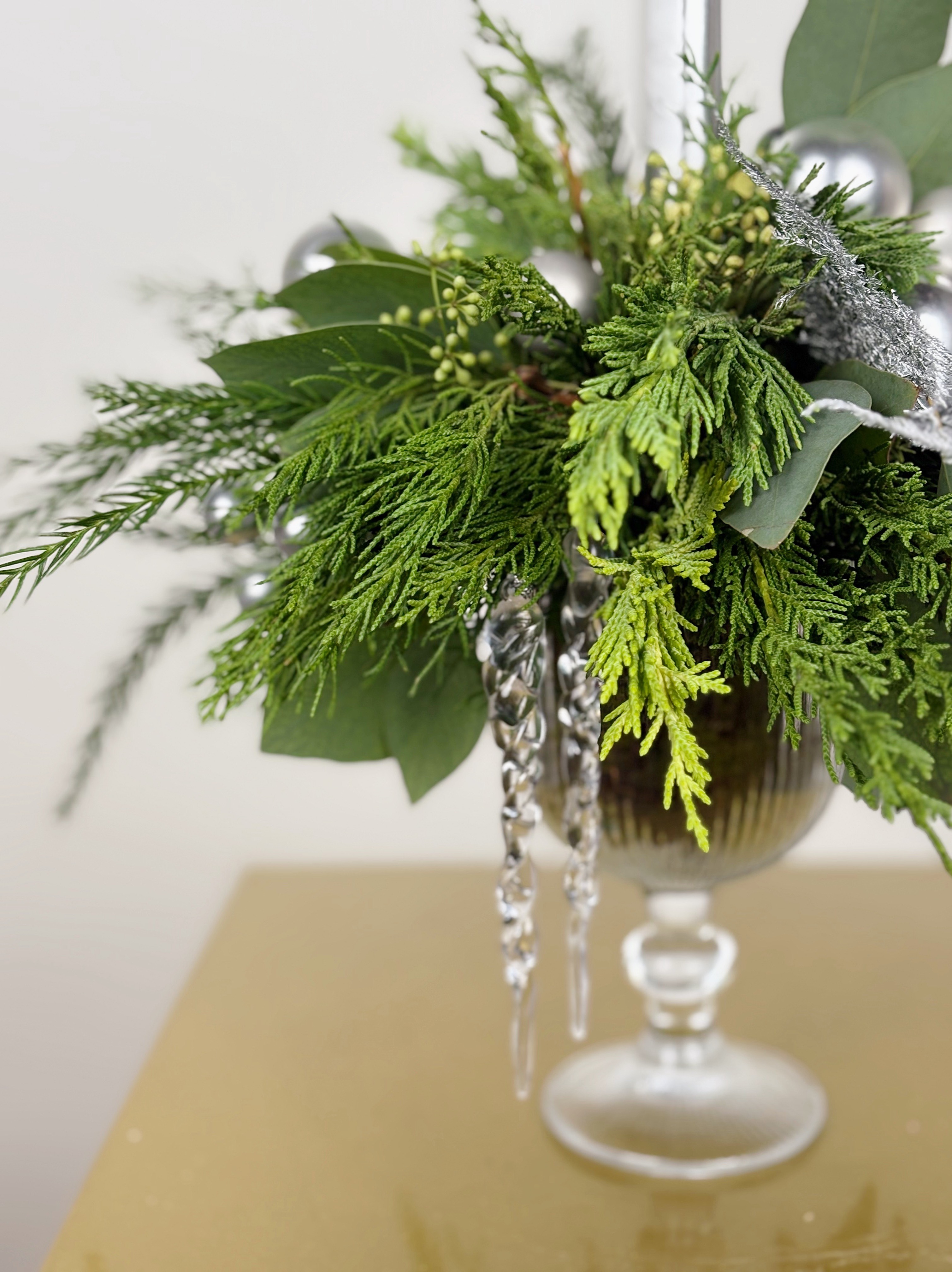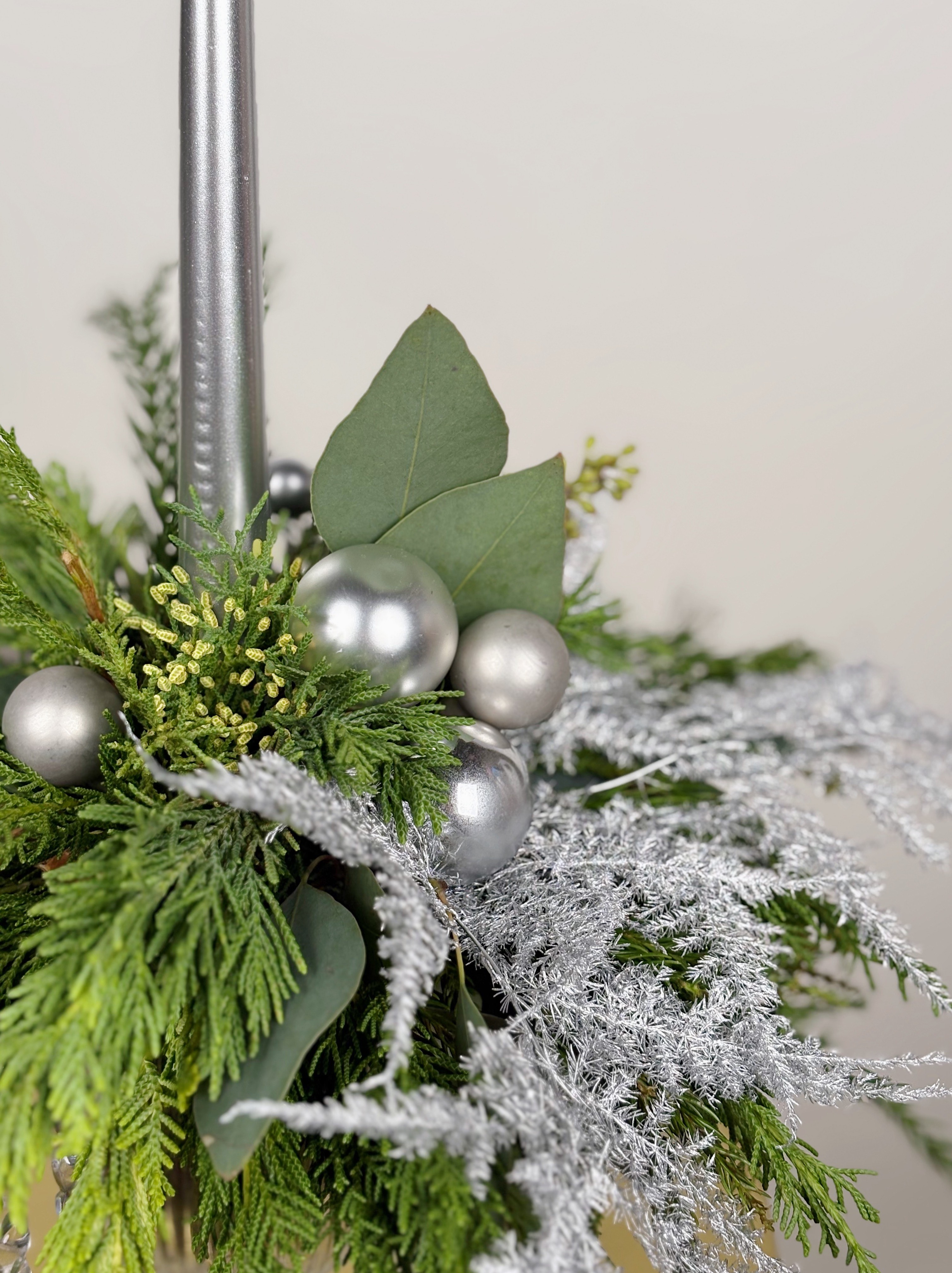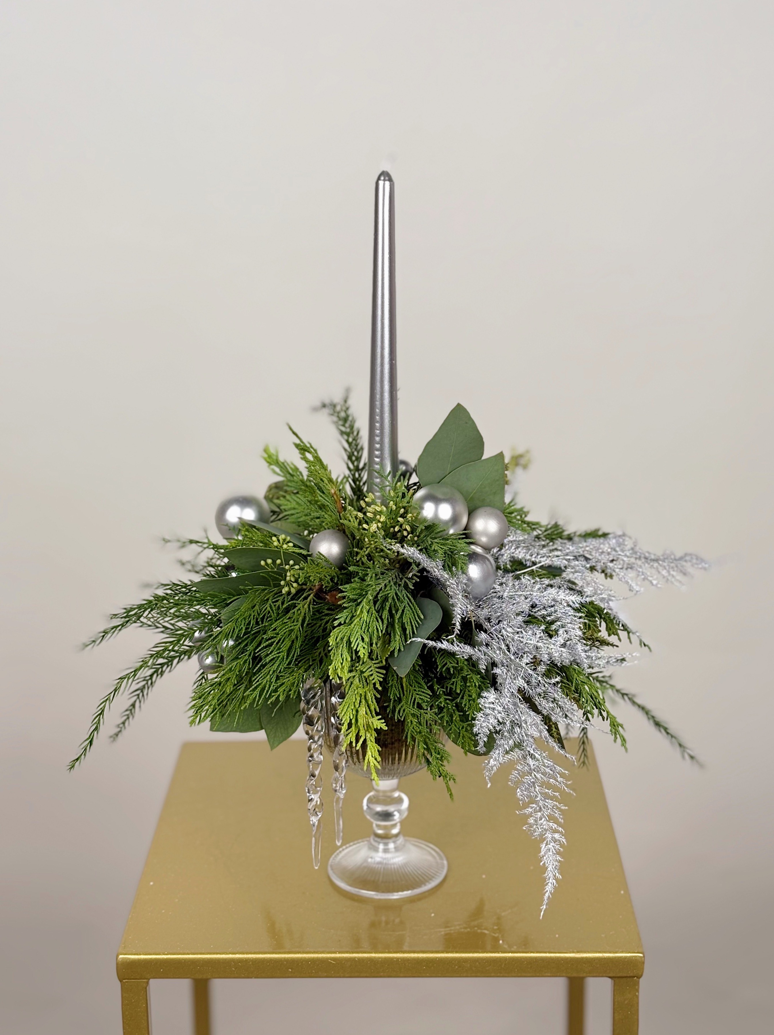 ХВОЯ В БОКАЛЕ СО СВЕЧЕЙ СЕРЕБРИСТОМ ОТТЕНКЕ