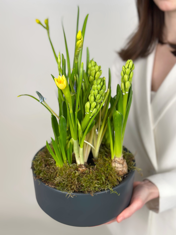 КОРЗИНА С ЛУКОВИЧНЫМИ ВЕСЕННИМИ ЦВЕТАМИ №4