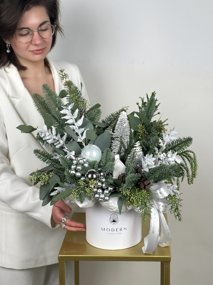 КОМПОЗИЦИЯ ИЗ ХВОИ И ЭВКАЛИПТА В ШЛЯПНОЙ КОРОБКЕ