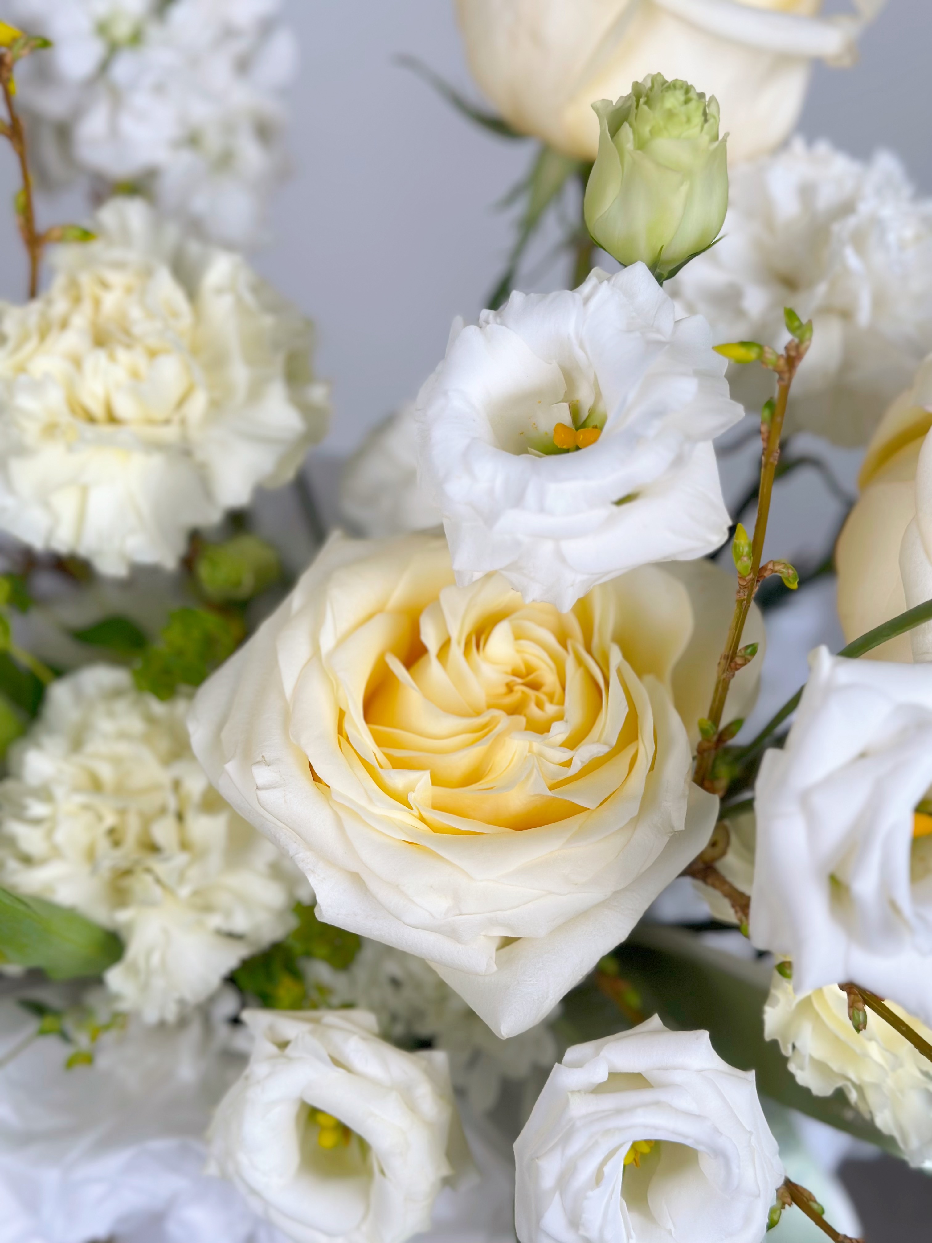 КОМПОЗИЦИЯ С ПИОНОВИДНОЙ РОЗОЙ, МАТТИОЛОЙ И ВЕТОЧКОЙ ФОРЗИЦИИ