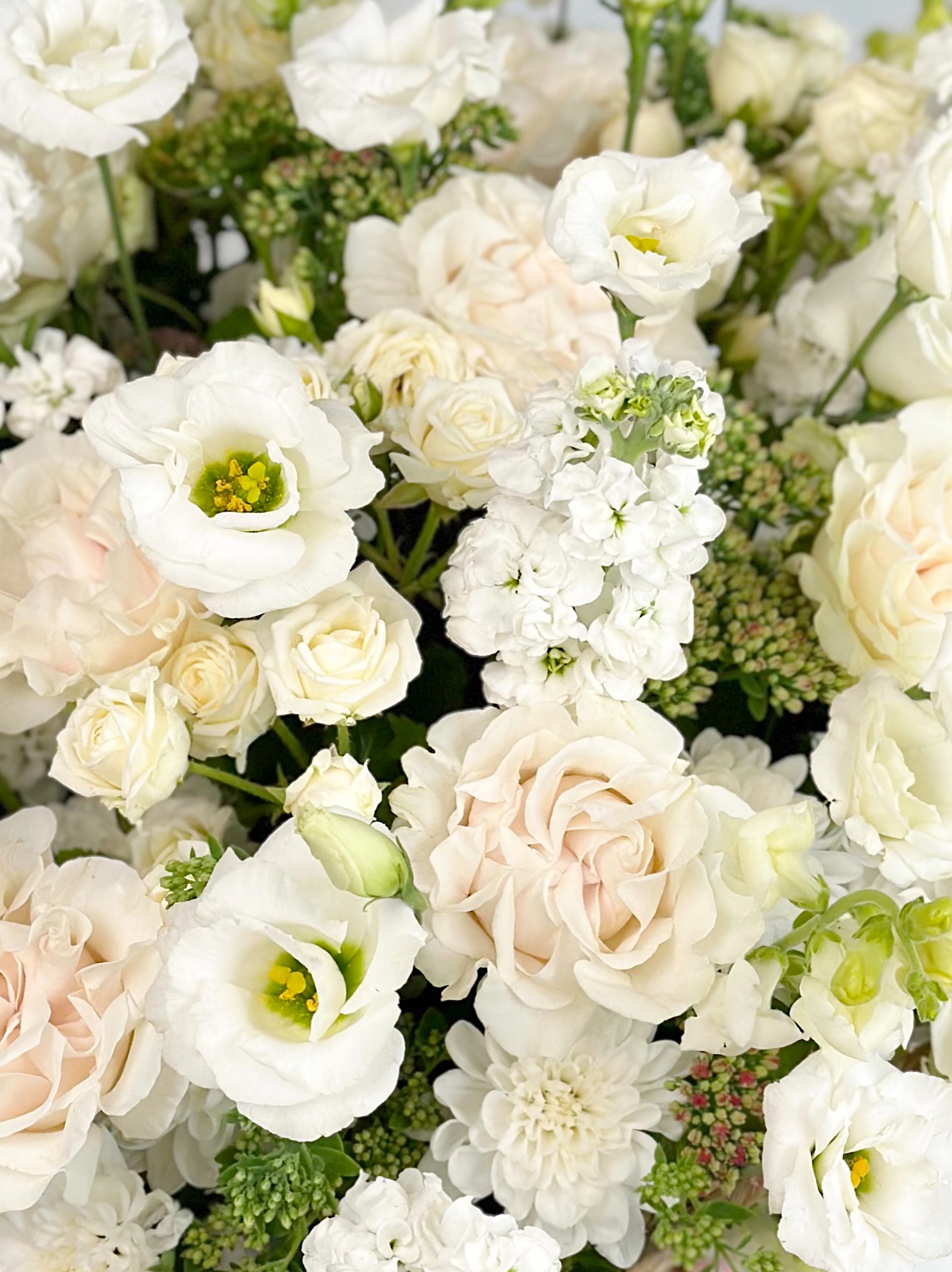 —ПИОНОВИДНАЯ РОЗА, ЭУСТОМА, МАТТИОЛА В БОЛЬШОЙ ПЛЕТЕНОЙ КОРЗИНЕ